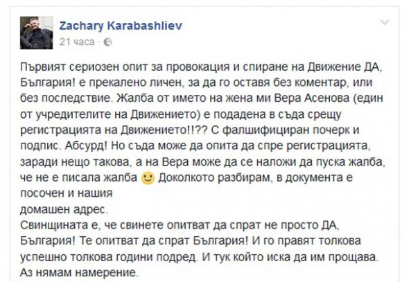 „Първият сериозен опит за провокация и спиране на Движение ДА, България! е прекалено личен, за да го оставя без коментар или без последствие. Жалба от името на жена ми Вера Асенова (един от учредителите на Движението) е подадена в съда срещу регистрацията на Движението!!?? С фалшифициран почерк и подпис. Абсурд! Но съда може да опита да спре регистрацията, заради нещо такова, а на Вера може да се наложи да пуска жалба, че не е писала жалба 🙂 Доколкото разбирам, в документа е посочен и нашия домашен адрес.
