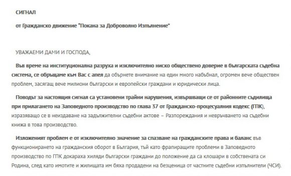 „Поводът за настоящия сигнал са установени трайни нарушения, извършващи се от районните съдилища при прилагането на Заповедното производство по глава 37 от Гражданско-процесуалния кодекс (ГПК), изразяващо се в неиздаване на задължителни съдебни актове – Разпореждания и невръчването на съдебни книжа в това производство. Изложеният проблем е от изключително значение за спазване на гражданските права и баланс във функционирането на гражданския оборот в България, тъй като фрапиращите проблеми в Заповедното производство по ГПК докараха хиляди български граждани до положение да са клошари в собствената си Родина, след като имотите и жилищата им бяха продадени на безценица от частните съдебни изпълнители (ЧСИ).