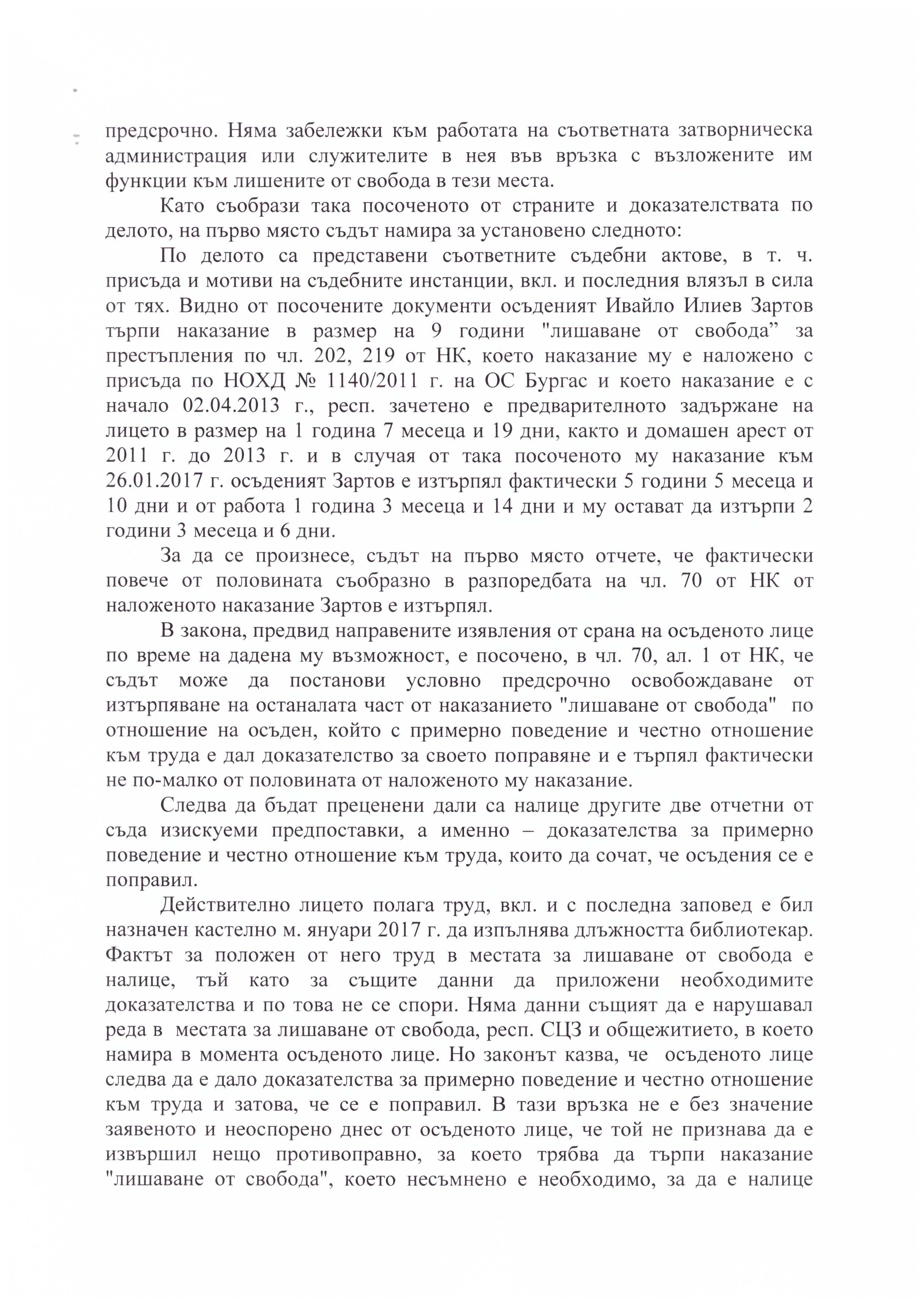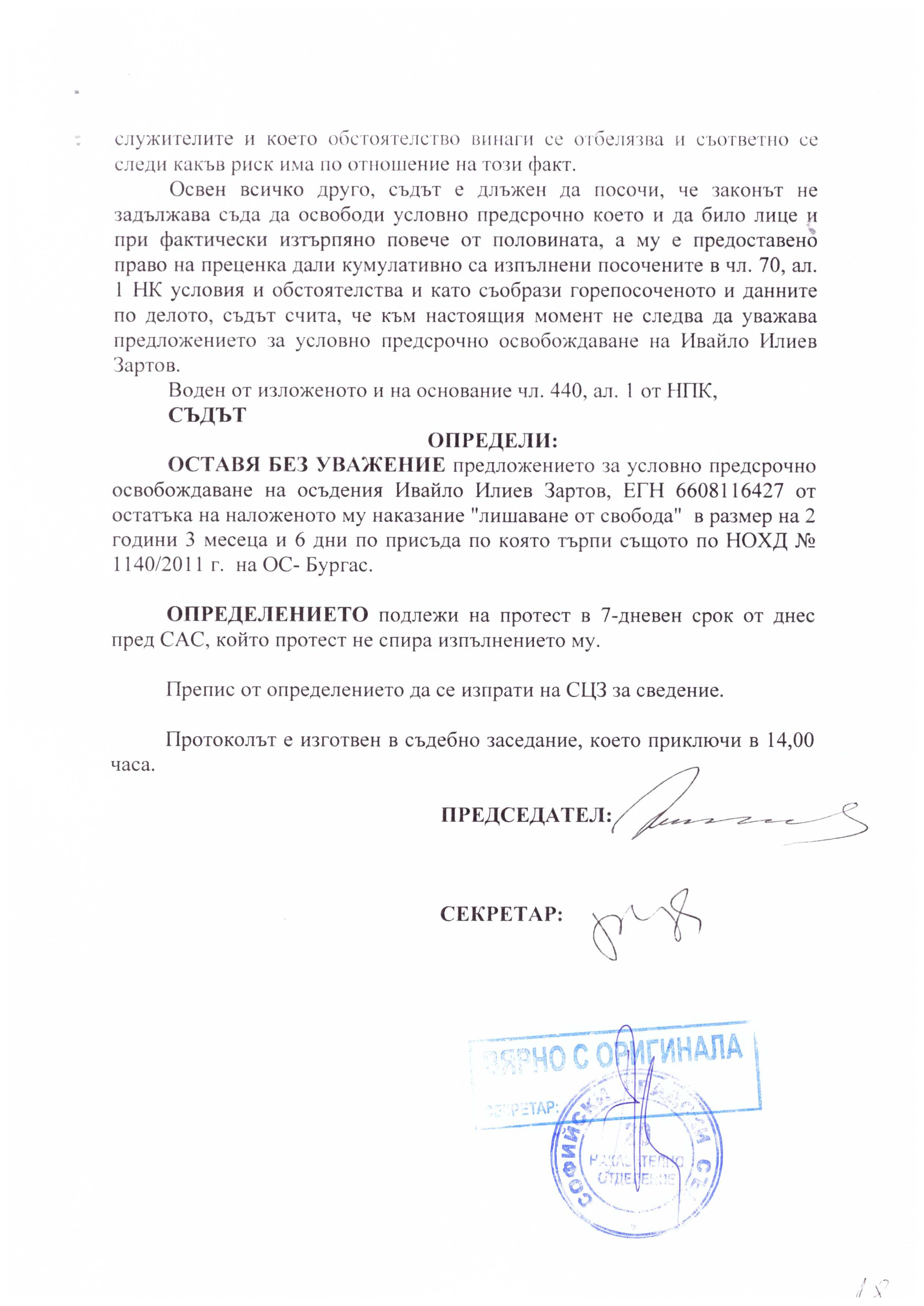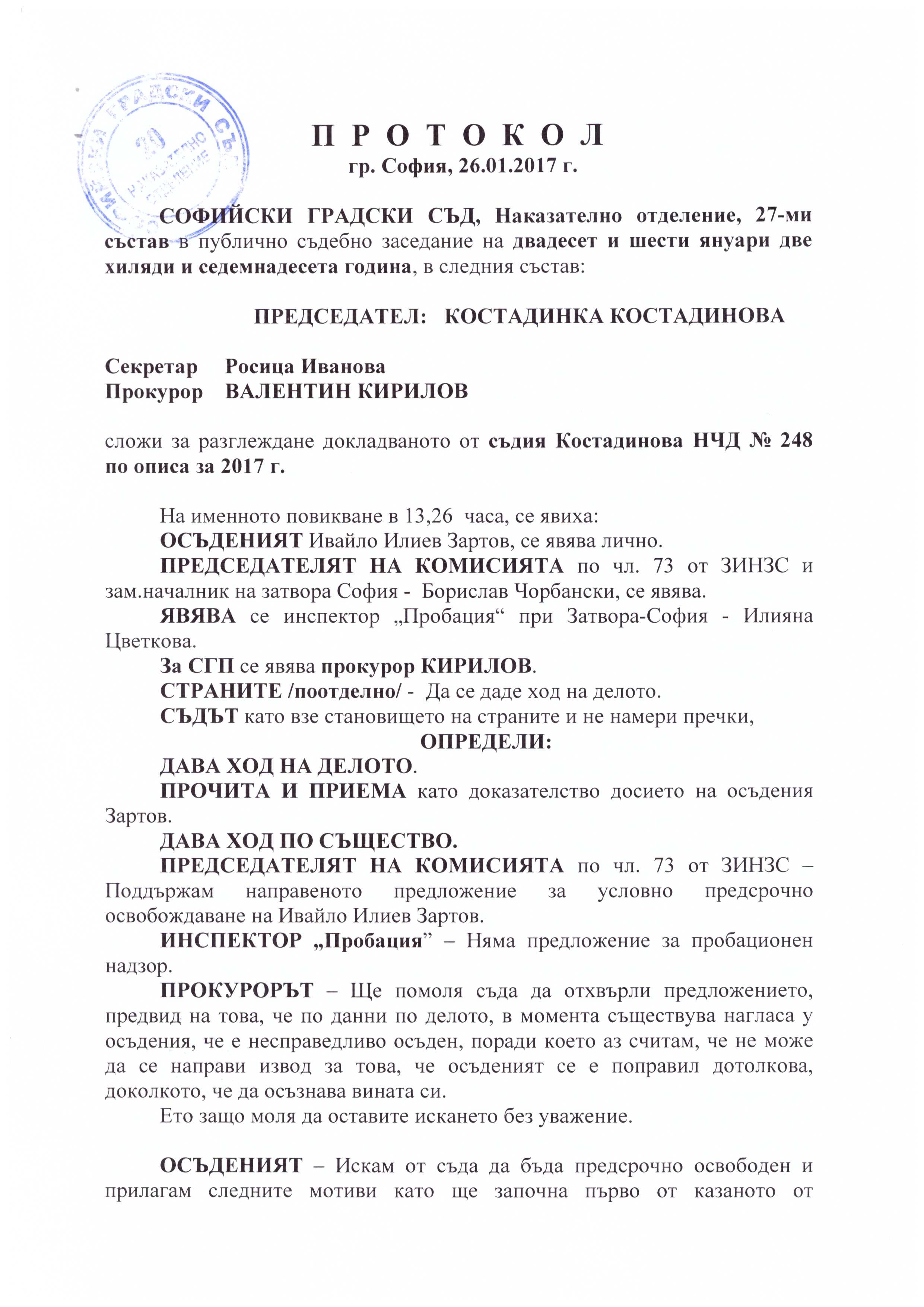 Какво вече писахме в Еврочикаго (вж. тук), на 26 януари т.г. в сградата на Централния софийски затвор се проведе заседание за Условно предсрочно освобождаване, на който се гледа и дело за УПО на Ивайло Зартов. Заседанието бе председателствано от съдия Костадинка Костадинова от 27 състав на СГС, наблюдаващ прокурор бе Валентин Кирилов от СГП. Решението на съдия Костадинова бе да не уважи предложението за освождаването на Зартов, понеже не се е признал за виновен и не се е „поправил“. На същото мнение бе и прокурорът Кирилов, който се изказа против това на делото да бъде даден ход. Кой какво е казал по време на заседанието по това дело може да се прочете в официалния протокол, факсимиле от който е публикувано по-долу.