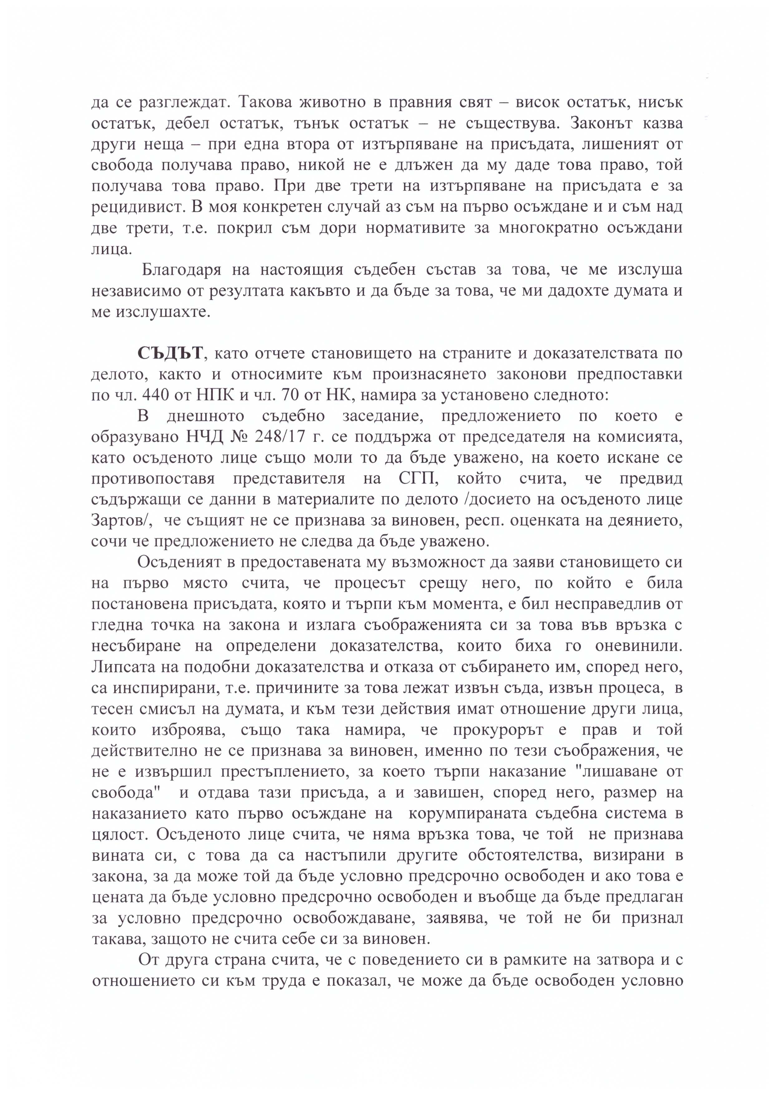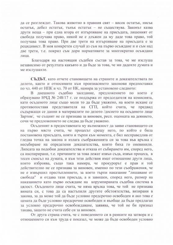 Това, което можем да добавим, и което не би могло да се разбере чрез протокола е, че прокурорът Валентин Кирилов единствено по делото за УПО на Зартов се изказа против. За всички останали 24 лишени от свобода, на които се гледаха делата на заседанието на 26 януари, прокурорът нямаше възражения. Но въпреки това дълго се рови в книжата пред себе си, докато каже защо е против да се даде ход точно на това дело.