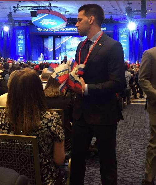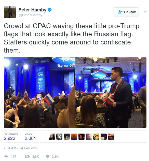 На снимката долу може да се види коментар на репортера Peter Hamby, който отбелязва, че CPAC служителиte бързо са осъзнали, че присъстващите всъщност размахват руски знамена, и са се разтичаха да ги конфискуват.