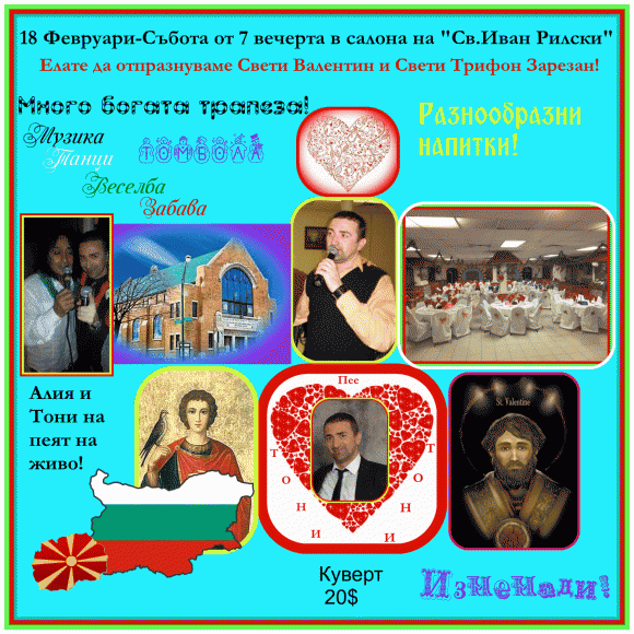 На празненството ще има музика, танци, забава, богата трапеза и изненади. Алия и Тони ще пеят на живо. Кувертът е $ 20. Всеки, който желае да отпразнува със сънародници дълбоко вкоренения в българската традиция празник на Св. Трифон Зарезан, както и празника на Св. Валентин, който е станал традиция не само в страната, в която живеем, но вече и в България, е добре дошъл.
