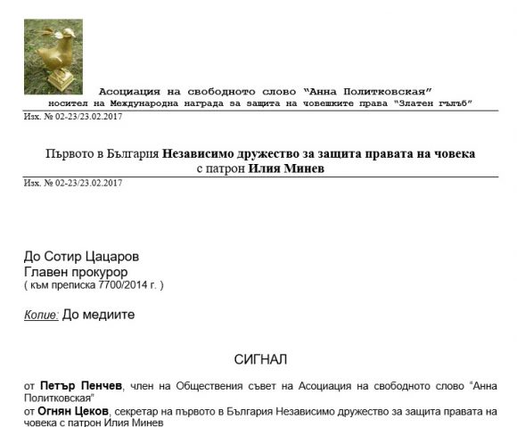 Инж. Петър Пенчев от Обществения съвет на Асоциация на свободното слово “Анна Политковская” и Огнян Цеков, секретар на първото в България Независимо дружество за защита правата на човека, изпратиха днес сигнал до главния прокурор Сотир Цацаров. Сигналът е изпратен относно съучастие на прокурор от Огръжна прокуратура – Видин в унищожаване на доказателства по делото за трагедията от 01.10.2014 г. в завод “Миджур”, с. Горни Лом, и в него се казва: