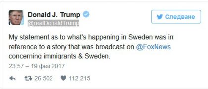Да се прехвърлим и към Швеция, „отдала се” в буквалния смисъл на думата на мигрантите. Преди дни във Флорида, президентът на САЩ Доналд Тръмп предизвика недоумение с изказване, което звучеше повече от странно. Последва не само учудване, но и доста шеги по адрес на президента-милиардер. „Трябва да осигурим безопасността в нашата страна!Погледнете само какво се случи миналата вечер в Швеция. В Швеция! Кой би могъл да повярва? В Швеция. Те пуснаха в страната си огромно количество бежанци и сега имат толкова проблеми, за които не са си и помисляли“ – каза Тръмп.