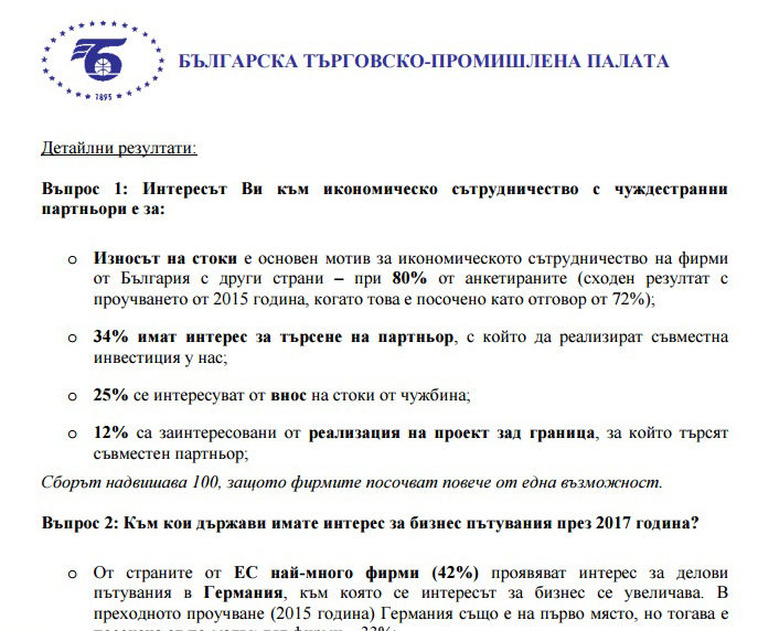 Българската търговско-промишлена палата извърши допитване, за да проучи намеренията на фирмите за разширяване на дейността им зад граница през 2017 г. Данните ще се използват при подготовка на програмата на БТПП за бизнес делегации в чужбина и организиране на форуми в страната с чуждестранни представители. Палатата се ангажира да изпрати обобщение на анкетата до президентството и бъдещото правителство. Проучването е проведено по електронен път в периода 16-23 януари 2017 г.
