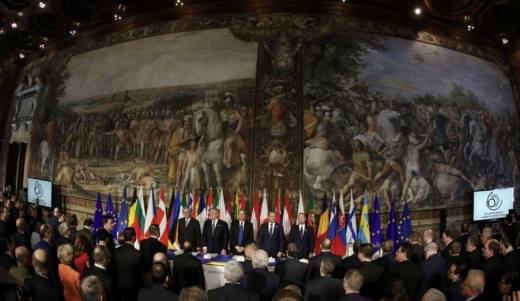 Днес ръководителите на 27-те държави от ЕС (Великобритания не участва в срещата) подписаха съвместната декларация по случай 60-годишната от основаването на Съюза (тогава Общ пазар). Церемонията се състоя в Двореца на консерваторите на капитолийския хълм в Рим – мястото, където навремето е създаден Общия пазар.