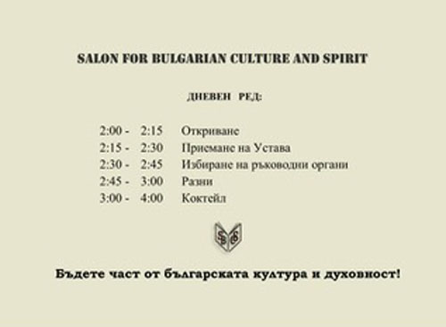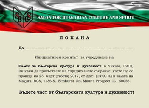 Учредяването на Салона за българска култура и духовност е събитие, отговорено за присъствие и участие на нашите сънародници в Чикаго, които биха проявили интерес и биха отделили от времето си да отидат на 25 март в залата на център „Магура“, където то ще се проведе.