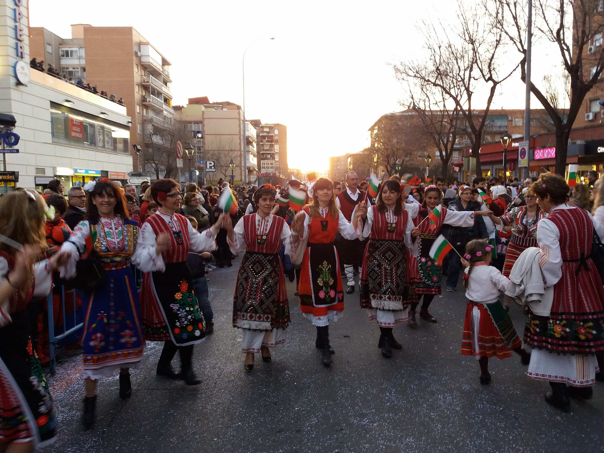 В карнавала в Мостолес се включиха всички – деца, родители, учители и приятели на училището. Сред нас имаше и испанци, облечени в български народни носии 🙂