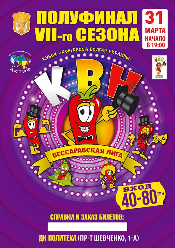 Одеса, Украйна. На 31 март 2017 г. от 19.00 ч. местно време, в Двореца на културата „Политех“ ще се проведе полуфинала на седми сезон на Бесарабската лига КВН за Купата на Конгреса на българите в Украйна. Младежите ще се състезават в конкурси по остроумие чрез отговори на въпроси, импровизации, предварително подготвени сценки, които показват социалните проблеми и човеките пороци през призмата хумора и шегите. Българският КВН традиционно се провежда в световната столицата на хумора – гр. Одеса. КВНът (Клуб на Веселите и Находчивите) не е ново мероприятие за жителите на Украйна. Над 50 години това е една от най-гледаните игри. Но КВН на български език се проведе за първи път в Одеса през 2010 г.