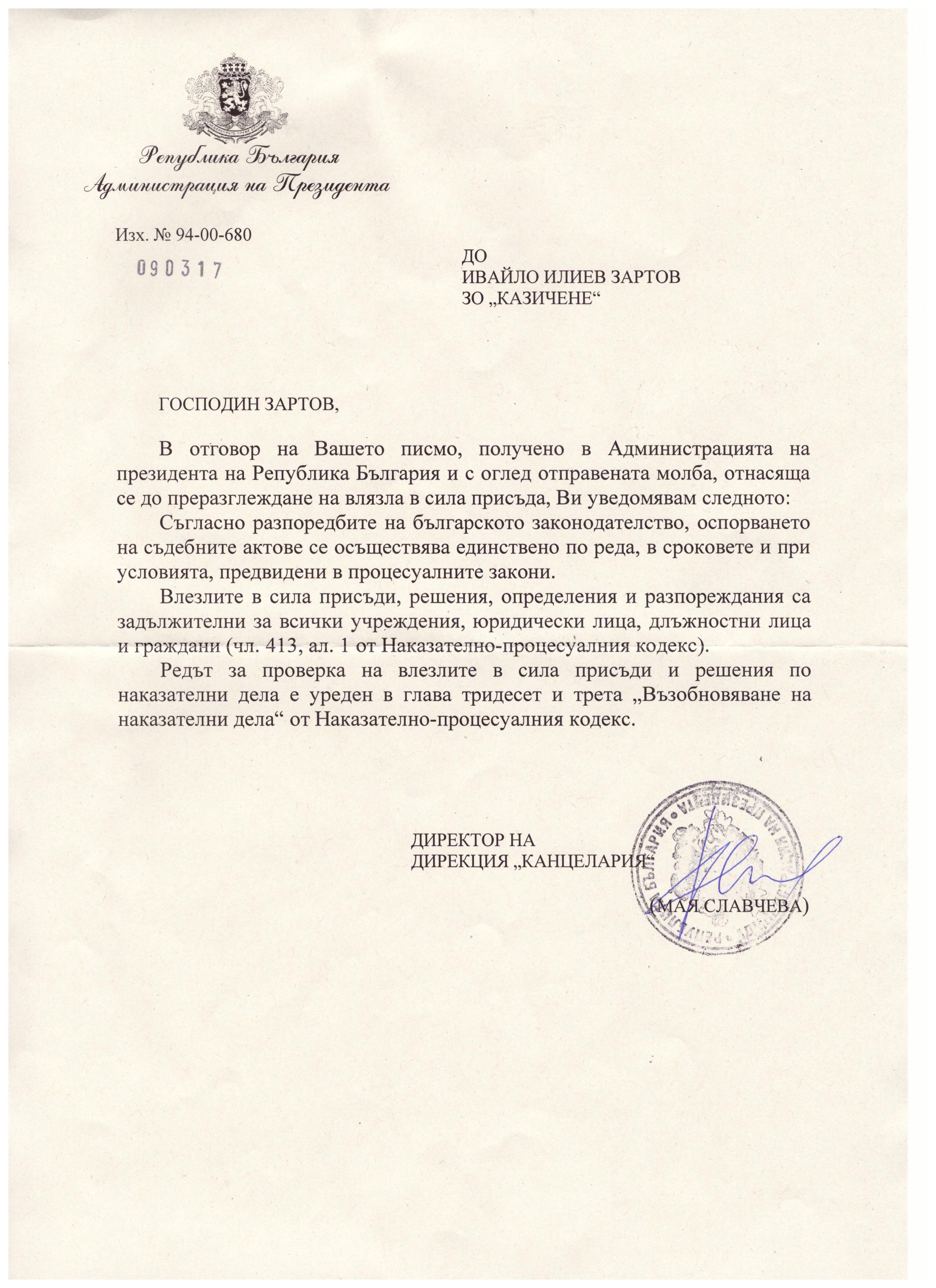 Бих искала да отбележа, че писмото на съпруга ми НЕ Е адресирано до посочената служителка, в писмото НЕ съществува молба за „преразглеждане на влязла в сила присъда“, както е посочила в отговора си Славчева. Много добре сме наясно с правомощията Ви като Президент, и сме запознати, че Вие нямате такива да се намесвате в работата на съдебната власт. Вашата служителка си е позволила да ни указва реда за „Възобновяване на наказателни дела“, който ни е добре известен, но в конкретния случай е отдавна използвана възможност, на която получихме отказ, въпреки подписката от граждани и организации, която беше отправена до Главния прокурор Сотир Цацаров в законовия срок след окончателната присъда. Вероятно не само писмото на Ивайло Зартов не е достигнало до Вас, но и въпросната служителка, която го е чела, не е вникнала в съдържанието му, а ловко ни е отпратила и насочила към действия, които са абсолютно неприложими в случая. При едно дело, поръчково от самото начало до края, възможностите за възтържествуване на справедливостта за този човек, за съжаление са явно нулеви.