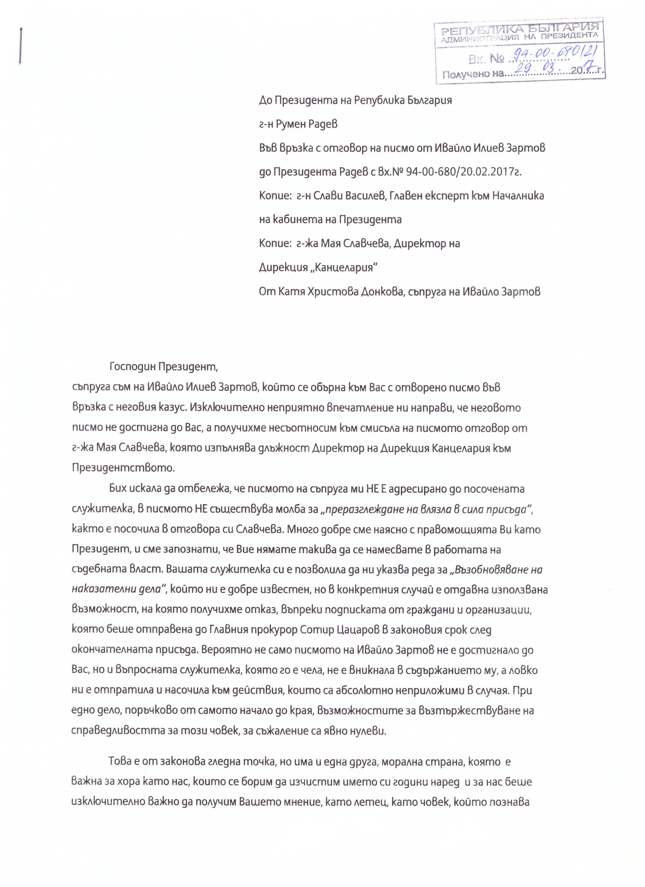 След като служителка от президентската администрация върна формален отговор на писмото на Ивайло Зартов до президента Румен Радев, изпратено на 20.02.2017 г. (писмото на Зартов – вж. тук), съпругата на Зартов Катя Донкова се обърна днес също към държавния глава. В писмото си до президента Катя Донкова казва: