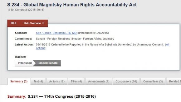 Законът „Магнитски“, който бе приет в САЩ през 2012 г. и първоначално касаеше налагането на визови и имуществени санкции само за определени руски граждани, замесени с преследването и гибелта на руския юрист Сергей Магнитски, впоследствие бе допълнен и изменен. Той се превърна в Глобален закон „Магнитски“, по силата на който всяко чуждестранно физическо или юридическо лице, замесено в престъпления, свързани с нарушаването на международни признати човешки права, подлежи на такива визови и имуществени санкции от страна на САЩ.