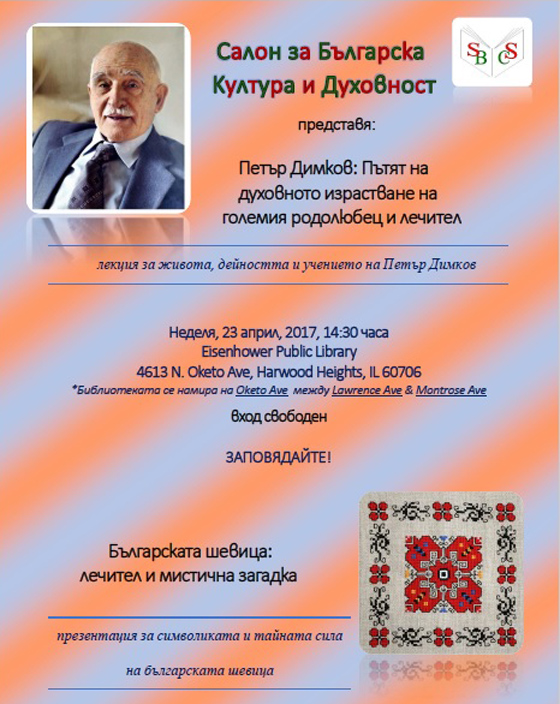 Салонът за българска култура и духовност в Чикаго представя на 23 април, неделя, от 14.30 ч., лекция на тема „Петър Димков: Пътят на духовното израстване на големия родолюбец и лечител“, както и презентация за символиката и тайната сила на българската шевица.