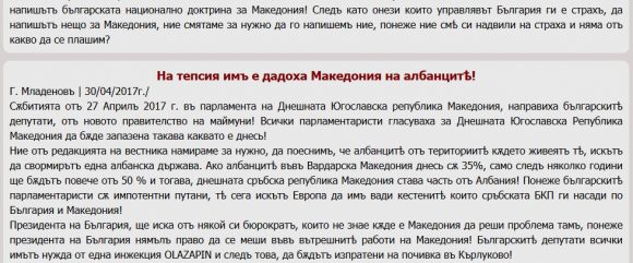 Вардарска Македония днесь е предъ края на своята сърбо-македонска агония! Албанцитѣ, които живеяьтъ въвъ Вардарска Македония, искътъ признание че сѫ частъ отъ тази Макадония и искътъ, албанскиятъ езикъ да бѫде офецияленъ езикъ на поробена отъ сърбитѣ Вардарска Македония! Онези, които управлявътъ Македония за сърбитѣ, немътъ намерение да позволятъ канонизирането на територията! Македония е очаква разделяне между Албания и България! За това разделяне писаха интересни лидери отъ свѣтовното научно пространство!