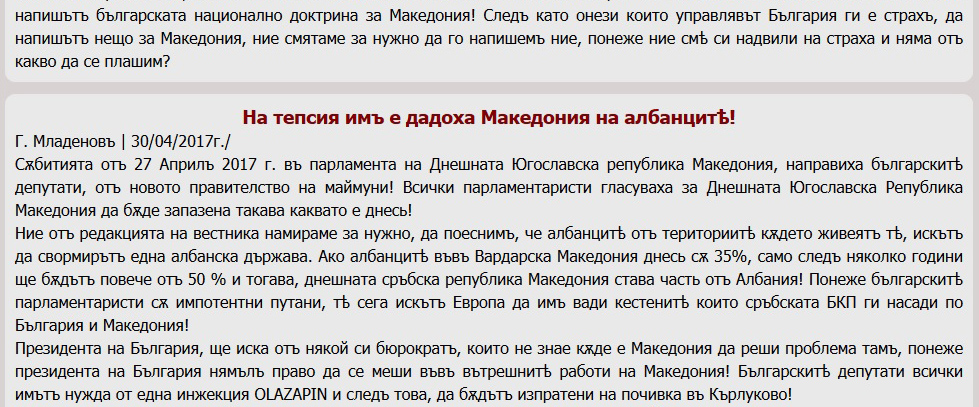 Ние отъ редакцията на вестника намираме за нужно да поеснимъ, че албанцитѣ отъ териториитѣ, кѫдето живеятъ тѣ, искътъ да свормирътъ една албанска държава! Ако албанцитѣ въвъ Вардарска Македония днесь сѫ 35%, само следъ няколко години ще бѫдътъ повече отъ 50 % и тогава, днешната сръбска република Македония става часть отъ Албания! Понеже българскитѣ парламентаристи сѫ импотентни путани, тѣ сега искътъ Европа да имъ вади кестенитѣ, които сръбската БКП ги насади по България и Македония!