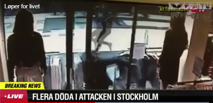 Норвежкият ТВ канал VGTV публикува на сайта си видео от терористичния акт в Стокхолм с камиона, мачкащ хората. На видеото се вижда как минувачите бягат панически и се опитват да се скрият в един магазин. Някои успяват секунди преди каминът да профучи през тях и да ги прегази.