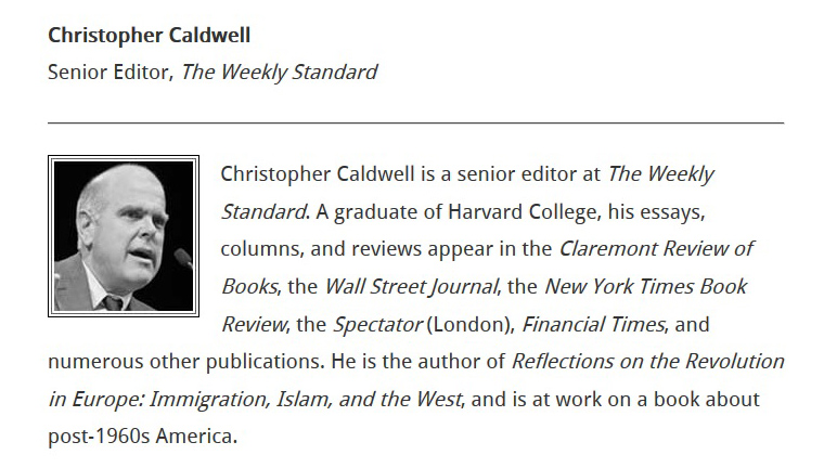 Кристофър Колдуел е старши редактор на „Weekly Standard“. Завършил е Harvard College; есетата, колоните и отзивите му се появяват в ‘’Claremont Review of Books’’, ‘’Wall Street Journal’’, „New York Times Book Review“, ‘’Spectator ‘’(London), ‘’Financial Times’’ и много други публикации. Той е автор на размисли за революцията в Европа: имиграцията, исляма и Запада, и работи върху книга за Америка след 60-те години на миналия век.