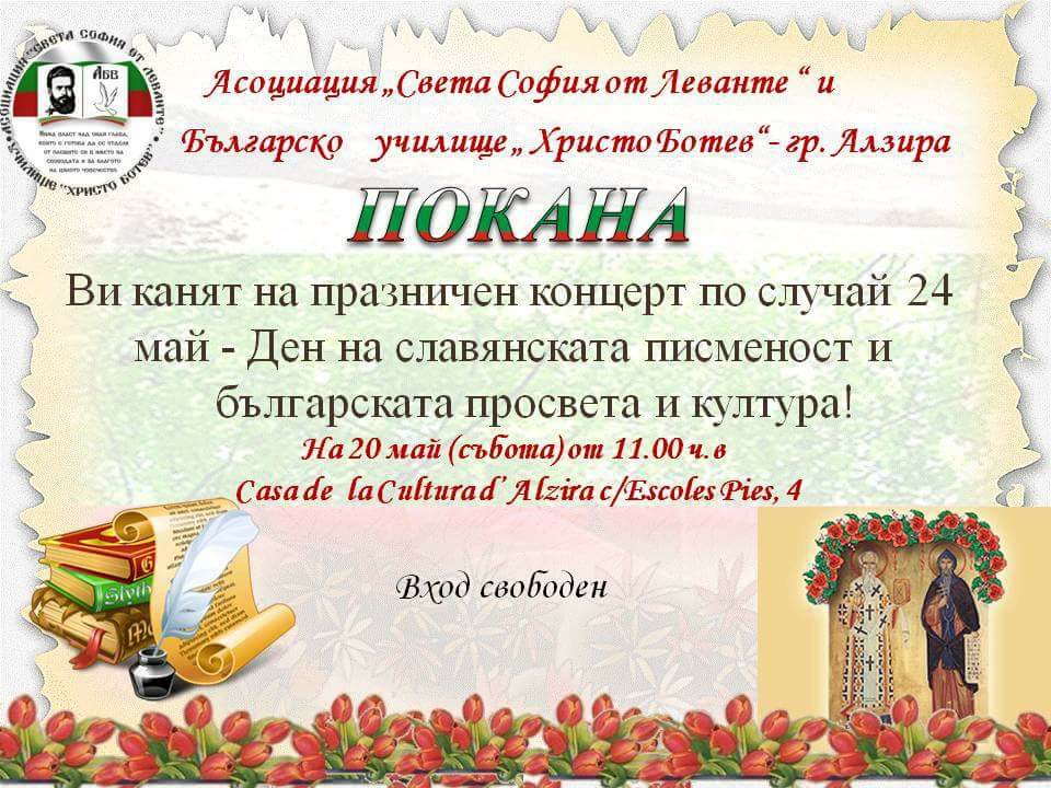 Асоциация „Света София от Леванте“ и Българско училище „Христо Ботев“ – гр. Алзира, Испания, канят всички сънародници, които имат желание и възможност, на празничен концерт по случай Деня на българската просвета и култура и на славянската писменост 24 май.