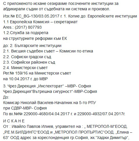 С настоящото Ви уведомяваме, че изискваме от съдебните и административни органи в Република България с оглед задължението за прилагането на примата на правото на ЕС (ПЕС), включително с вх.№ 46406/06.04.2017 г. в СГС с платена д.т. (оставен иск за прилагане на ПЕС без движение до момента – вж. в този смисъл Решение от 22 юни 1989 г. по дело Costanzo, 103/88, Recueil, стр. 1839, точка 33, Решение от 11 януари 2007 г. по дело ITC, C208/05, Решение по дело Fuß С-243/09 на Съда на ЕС от 14.10.2010 г.) и сезирането лично на и.д.председателя на СРС – съдия Стефан Милев в приемния му ден на 15.03.2017 г., за недопустими процесуални нередности в хода на делата в СРС (липса на актове, липсва връчване на документи седем години) и последваща кореспонденция с него по ел.поща и чрез регистратурата на съда.