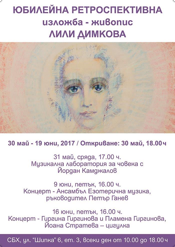 На 30 май 2017 г., от 18 ч. местно време, в залата на Съюза на българските художници на ул. „Шипка“ 6 в София, ще се открие Юбилейна ретроспекивна изложба живопис на Лили Димкова. Изложбата ще може да бъде посетена всеки ден, от 10 до 18 часа, до 19 юни.