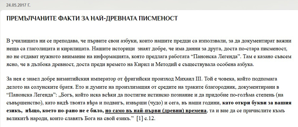 В училищата ни се преподава, че първите свои азбуки, които нашите предци са използвали, за да документират важни неща, са глаголицата и кирилицата. Нашите историци знаят добре, че има данни за друга, доста по-стара писменост, но не отдават нужното внимание на информацията, която предлага работата “Панонскa Легендa”. Там е казано съвсем ясно, че в дълбока древност, доста преди времето на Кирил и Методий, е съществувала особена азбука.