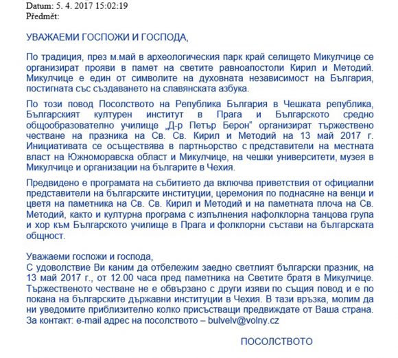 По този повод Посолството на Република България в Чешката република, Българският културен институт в Прага и Българското средно общообразователно училище „Д-р Петър Берон“ организират тържествено честване на празника на Св. Св. Кирил и Методий на 13 май 2017 г. Инициативата се осъществява в партньорство с представители на местната власт на Южноморавска област и Микулчице, на чешки университети, музея в Микулчице и организации на българите в Чехия.“