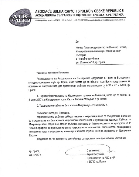 Както нашето издание вече писа (вж. тук), Асоциацията на българските сдружения в Чешката република и Българският културно-просветен клуб в Прага отправят в края на м. януари т.г. официална покана до българския посланик в Чехия Лъчезар Пeтков да стане патрон на две много важни за живота на местната общност събития – на тържественото честване на българския Национален празник 3-ти март в катедралния храм „Св. св. Кирил и Методий“ в Прага и на Традиционния събор на българите в Микулчице, който се провежда всяка година през май.