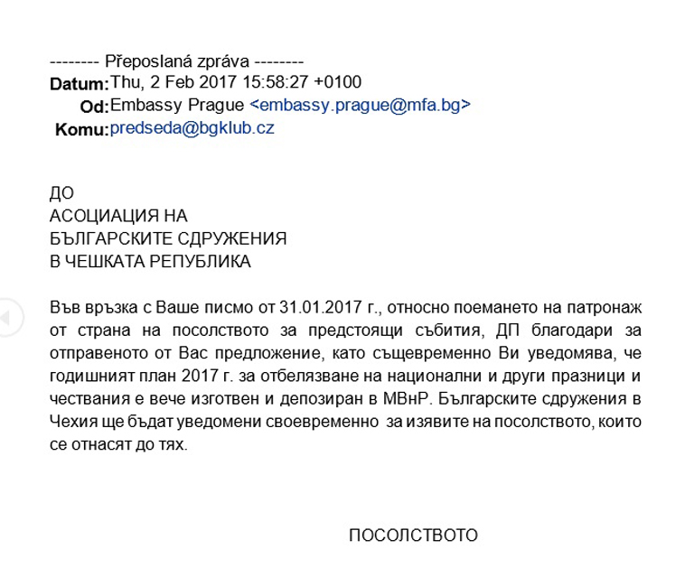 Българското посолство в Прага изпраща на 2 февруари т.г. отговор на тази покана. В него се казва: „Във връзка с Ваше писмо от 31.01.2017 г., относно поемането на патронаж от страна на посолството за предстоящи събития, ДП благодари за отправеното от Вас предложение, като същевременно Ви уведомява, че годишният план 2017 г. за отбелязване на национални и други празници и чествания е вече изготвен и депозиран в МВнР.“