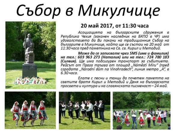 Така тази година се оказва, че ще има два „традиционни“ български Събора в Микулчице. Един, който се организира на 20 май от Асоциацията на българските сдружения в Р. Чехия (вж. тук), и друг, който ще бъде седмица преди това, на 13 май, и се организира от Посолството.