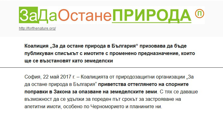 София, 22 май 2017 г. – Коалицията от природозащитни организации „За да остане природа в България“ приветства оттеглянето на спорните поправки в Закона за опазване на земеделските земи. С тях се даваше възможност да се удължи за пореден път срокът за застрояване на апетитни имоти, особено по Черноморието и планините ни.