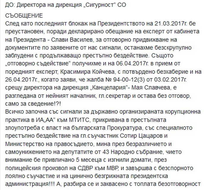 След като последният блокаж на Президентството на 21.03.2017 г. бе преустановен, поради декларирано обещание на експерт от кабинета на Президента – Слави Василев, за отговорно придвижване на документите по заявените от нас сигнали, останахме безскрупулно заблудени с продължаващо престъпно бездействие. Същото „отговорно съдействие” получихме и на 06.04.2017 г. в прием от поредният експерт, Красимира Койчева, с потвърдено безхаберие и на 26.04.2017 г., когато заяви, че жалба № 94-00-12(3) от 03.02.2017 г. срещу директора на дирекция „Канцелария”- Мая Славчева, е разгледана от нейния началник, гл. секретар, и остава без отговор, само за сведение!?!