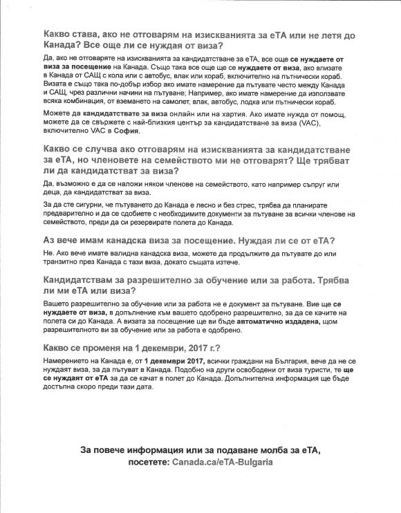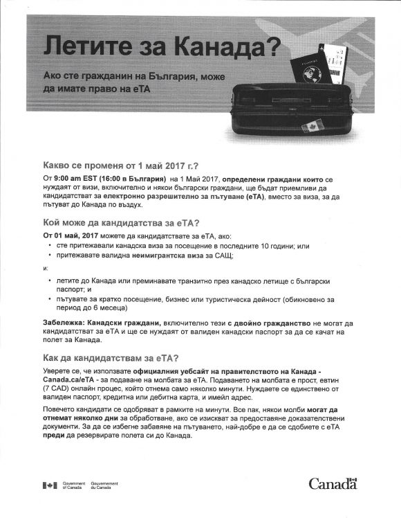 От Българското генерално консулство в Чикаго разпространиха информация за новия режим на пътуване до Канада, важащ за български граждани след 1 май 2017 г. – Canada – travel. Документът е бил получен в ГК – Чикаго по официален дипломатически път.