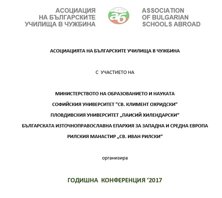 Десетата юбилейна годишна конференция на Асоциацията на българските училища в чужбина ще се състои в София и в Рилския манастир, съответно на 26 и на 27-28 юли тази година. Конференцията се организира с участието на Министерството на образованието и науката, СУ „Св. Климент Охридски“, ПУ „Паисий Хилендарски“, Западноевропейската епархия на БПЦ и Рилския манастир „Св. Иван Рилски“. Конференцията, която се провежда под надслов „10 ГОДИНИ АСОЦИАЦИЯ НА БЪЛГАРСКИТЕ УЧИЛИЩА В ЧУЖБИНА – ВЪЗРОДИТЕЛ И ПОСЛАНИК НА СЪВРЕМЕННА БЪЛГАРИЯ ПО СВЕТА 2007-2017″, ще бъде открита на 26 юли 2017 г. от 9 часа българско време в Аулата на Софийския университет.