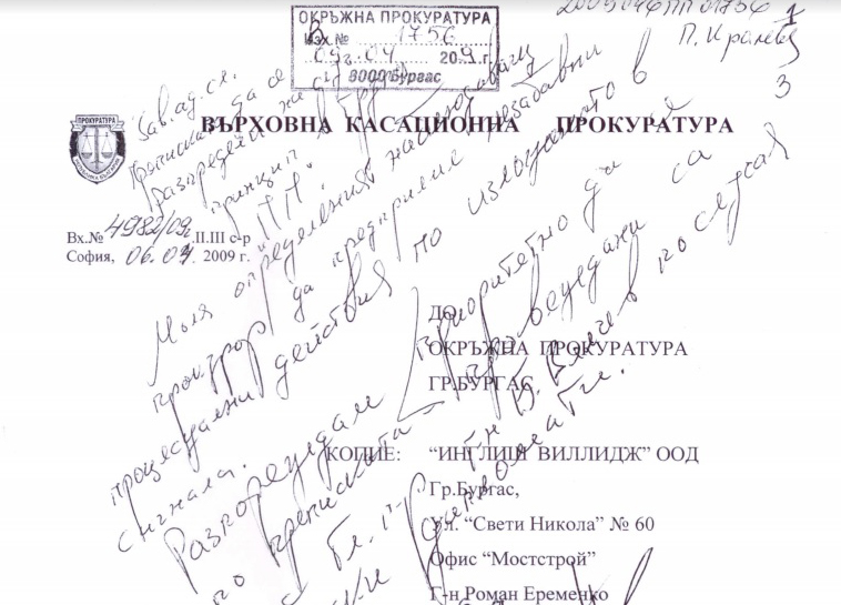 Факт №1: Съществува официален документ – разпореждане на Върховна касационна прокуратура до Окръжна прокуратура – Бургас. В преписката с вх. № 4982/2009 г. На ВКП, по сигнал на Роман Еременко – представляващ „Инглиш вилидж ООД“ – на ръка е написана следната резолюция: „Моля определеният наблюдаващ прокурор да предприеме незабавни процесуални действия по изложеното в сигнала. Разпореждам приоритетно да се работи по преписката – провеждани са срещи с Главния прокурор г-н Б.Велчев с руски дипломати – 09.04.09 г.“ (приложение). Това разпореждане е родено през 2009 г., след нарочни срещи между руски дипломати и българския Главен прокурор Борис Велчев. Вижте го, прочетете го внимателно и си отговорете сами. В коя държава, в която законът е равен за всички и има справедливост, правосъдие и морал, е необходимо руски, американски или каквито и да било други дипломати да се срещат многократно с Главния прокурор и да му оказват натиск, за да бъде осъден някакъв български гражданин?!? Не е ли това загуба на суверенитет, след като Главният прокурор изпълнява поръчки на чужда държава? България васална държава ли е? Да не би да сме все още 16-тата република от СССР? Във всяка истински свободна страна тези чужди дипломати щяха да получат гневни дипломатически ноти, Главния прокурор щеше да бъде обвинен и разследван за държавна измяна. Но в съвременна България нещата стоят малко по-другояче. Кой да разследва държавен обвинител №1? Господ Бог ли? Кой ще постави на мястото им самозабравилите се чужди дипломати? Проститутките, наричащи себе си български политици, те ли?