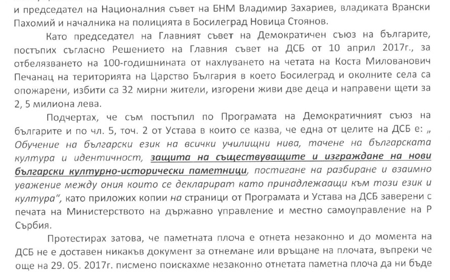 Като председател на Главният съвет на Демократичен съюз на българите, постъпих съгласно Решението на Главния съвет на ДСБ от 10 април 2017 г., за отбелязването на 100-годишнината от нахлуването на четата на Коста Милованович Печанац на територията на Царство България, в което Босилеград и околните села са опожарени, избити са 32 мирни жители, изгорени живи две деца и направени щети за 2, 5 милиона лева.