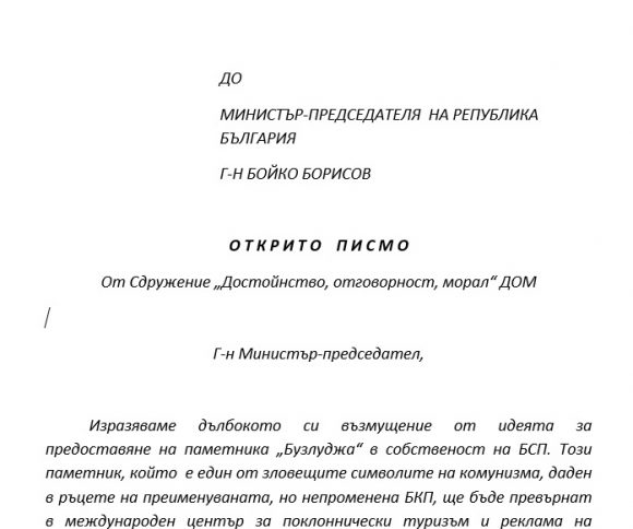 Изразяваме дълбокото си възмущение от идеята за предоставяне на паметника „Бузлуджа“ в собственост на БСП. Този паметник, който е един от зловещите символите на комунизма, даден в ръцете на преименуваната, но непроменена БКП, ще бъде превърнат в международен център за поклоннически туризъм и реклама на комунистическия режим. Припомняме, че през 2000 г. е приет закон, по силата на който комунистическият режим от 9 септември 1944 г. до 10 ноември 1989 г. е обявен за престъпен. Припомняме, че на 18 септември 2008 г. 40-то Народно събрание на Република България подкрепи „Пражката декларация“ от 3 юни 2008 г., с която се осъждат комунистическите жестокости и в която се настоява националните парламенти на страните от Европа да признаят комунистическите престъпления срещу човечеството, както тези на нацизма. 23 август е обявен за Ден на възпоменание на жертвите на нацизма и комунизма. Припомняме, че миналата година парламентарната група на вашата партия ГЕРБ, внесе в Народното събрание и гласува на първо четене промени в Закона за обявяване на комунистическия режим за престъпен. С тези промени се предвижда инкриминиране на пропагандирането на комунистически символи. Обръщаме внимание и на разпоредбите на чл.108 от Наказателния кодекс, според които пропагандирането /в случая популяризиране на символите/ на фашистки и други антидемократични идеологии, се смята за престъпление.
