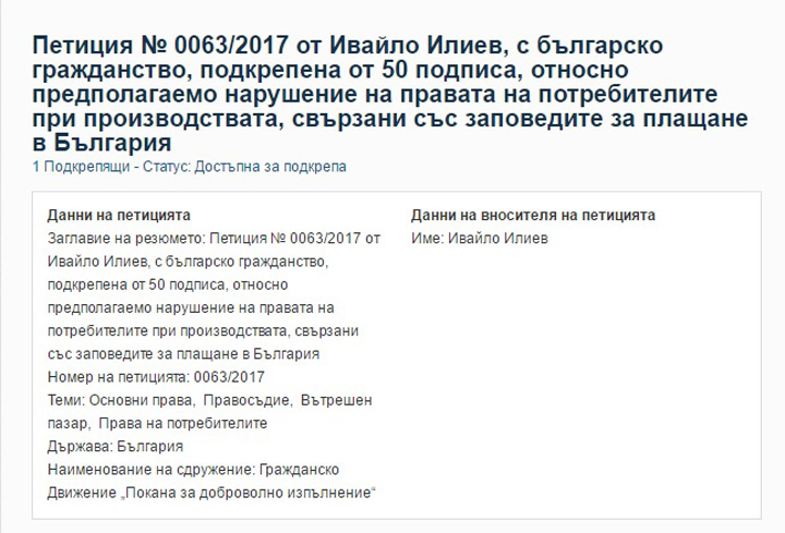 Петиция до Европейския парламент, № 0063/2017, изпратена от Ивайло Илиев от Гражданско движение „Покана за доброволно изпълнение“, е качена в сайта на ЕП и е достъпна за подкрепа. Вносителят на петицията смята, че изпълнението на принудителните платежни вземания в България не гарантира правата на потребителите и Европейският съюз следва да започне да разглежда нарушенията на правото на ЕС от страна на българската съдебна система.