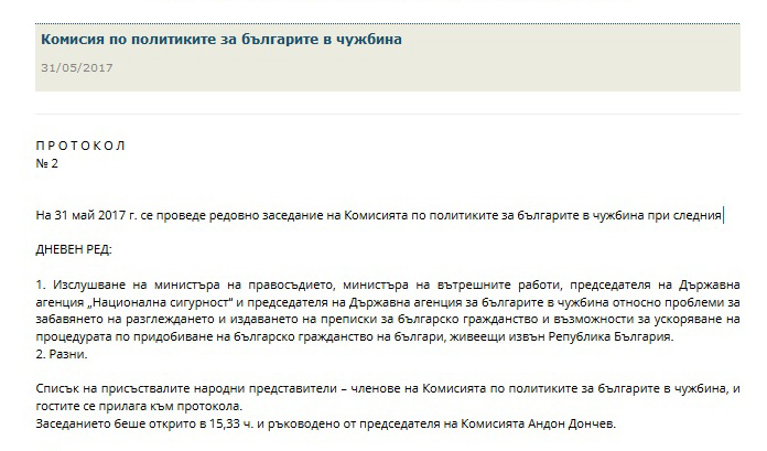 На 31 май 2017 г. се провежда заседание на Комисията по политиките за българите в чужбина /КПБЧ/ при 44-ото Народно събрание, в чито дневен ред влизат две точки: 1. Изслушване на министъра на правосъдието, министъра на вътрешните работи, председателя на Държавна агенция „Национална сигурност“ и председателя на Държавна агенция за българите в чужбина относно проблеми за забавянето на разглеждането и издаването на преписки за българско гражданство и възможности за ускоряване на процедурата по придобиване на българско гражданство на българи, живеещи извън Република България; 2. Разни. По-долу може да се види стенограмата от това заседание на Комисията, която е публикувана в сайта на НС.