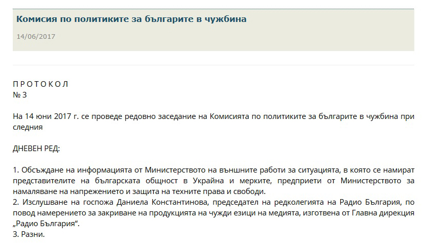 На 14 юни 2017 г. се провежда заседание на Комисията по политиките за българите в чужбина към Народното събрание, при дневен ред: 1. Обсъждане на информацията от Министерството на външните работи за ситуацията, в която се намират представителите на българската общност в Украйна и мерките, предприети от Министерството за намаляване на напрежението и защита на техните права и свободи; 2. Изслушване на г-жа Даниела Константинова, председател на редколегията на Радио България, по повод намерението за закриване на продукцията на чужди езици на медията, изготвена от Главна дирекция „Радио България“; 3. Разни. На заседанието присъства зам.-министър Юрий Щерк. Както и от БНР – Александър Велев, Виктор Серафимов, Свилена Симеонова, Албена Миланова и Мартин Минков; от “Радио България” – Даниела Константинова, Борил Караиванов, Аделина Григорова, Весела Кръстева, Атанас Асенов, Соня Касаветова и Силвия Николова.