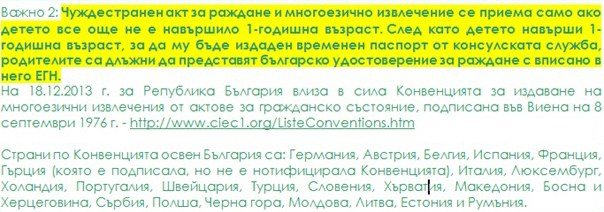 Политиката на българската държава спрямо регистрацията на родените в чужбина български деца от български граждани или смесени бракове е изцяло погрешна! Вместо да се улесни максимално, защото пределно ясно на всички е, че доста от тези деца, не само не стават българи нито по документи, нито по самосъзнание по ред причини, тяхната регистрация е направена както максимално бавно, трудно и скъпо, преминавайки през редица проблеми за гражданите. За едно родено дете в България, родителите не само не заплащат нищо по регистрацията му, а дори държавата дава помощ еднократна за неговото раждане. Узаконяването на един нов български гражданин роден в чужбина на родители излиза в средства и време между един до няколко месеца и от 100 до над 200 евро, а българската държава спестява помощта за новородено, която принципно се изплаща от чуждата държава, ако има предвидена такава. Почти минимален е броят на хората, получили такава помощ от България, въпреки, че живеят в чужбина.