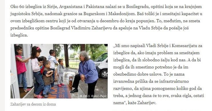 Бяха публикувани десетки патетични медийни съдържания, в които се омекотява проблемът и с апели за съпричастност, състрадатателност и хуманизъм се подготвя общественото мнение за настаняване на няколкостотин бежанци в Босилеград. Внушава се даже, че българите в България били „лоши“, а българите в Босилеград „добри“ към бежанците. Тиражират се наивни и необмислени твърдения, че настаняването им в Босилеград ще доведе до откриване на нови работни места, ще се увеличи оборота в търговската мрежа, ще се изгради инфраструктура и ще се създадат предпоставки за икономическо развитие на общината. (http://www.dw.com/sr/bosilegrad-ho%C4%87e-izbeglice/a-39193110)