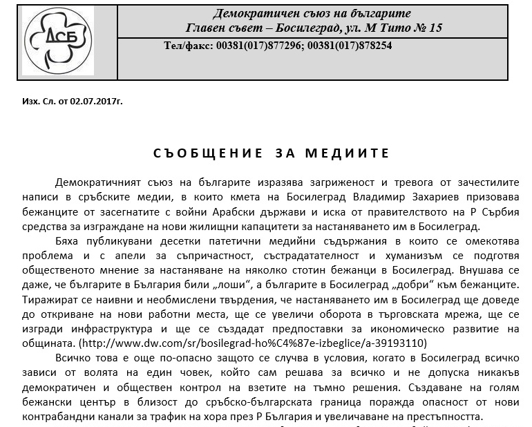 Демократичният съюз на българите изразява загриженост и тревога от зачестилите написи в сръбските медии, в които кметът на Босилеград Владимир Захариев призовава бежанците от засегнатите с войни арабски държави и иска от правителството на Р. Сърбия средства за изграждане на нови жилищни капацитети за настаняването им в Босилеград.