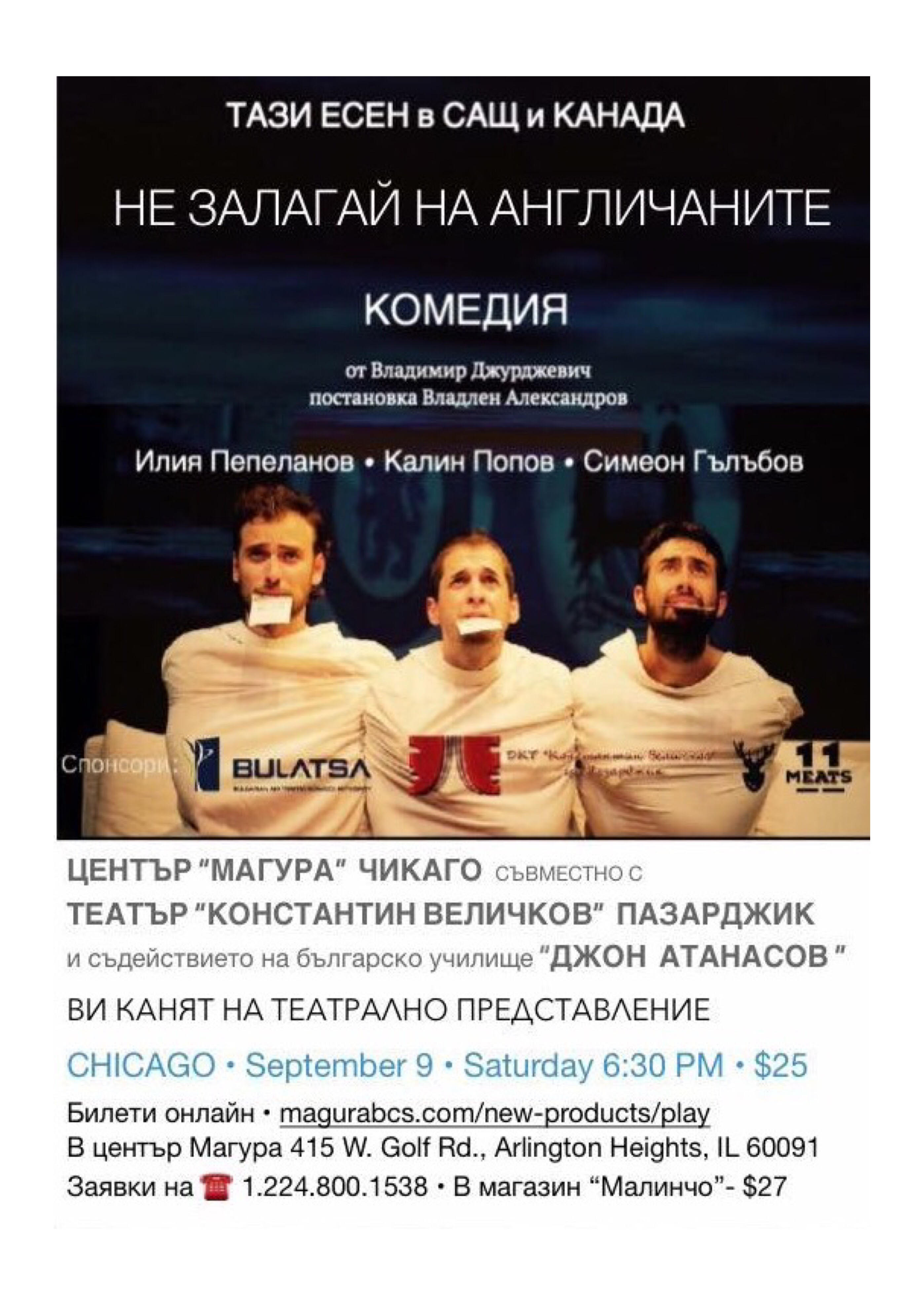 Център „Магура“ в Чикаго, съвместно с Театър „Константин Велчиков“ – Пазарджик и съдействието на Българско училище „Джон Атанасов“ в Чикаго, организират театрално събитие. Комедията на Владимир Джуркович „НЕ ЗАЛАГАЙ НА АНГЛИЧАНИТЕ“, постановка на Владлен Александров, ще се играе на 9 септември 2017 г., от 6,30 pm в Northbrook Theater. Участват Илия Пепеланов, Калин Попов и Симеон Гълъбов. Цена на билета $25. Заявки в магазин „Малинчо“ – $27. Билетите могат да се поръчат и онлайн в сайта на „Магура“.
