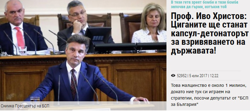 „Циганите ще станат капсул-детонаторът за взривяването на държавата“ – предупреди от парламентарната трибуна депутатът от „БСП за България“ Иво Христов, цитиран от „Канал 3“. Той взе думата, възмутен от констатацията в правителствен доклад, че има напредък в областта на интеграцията на циганите у нас. Според социолога с подобни документи само се отчита дейност.