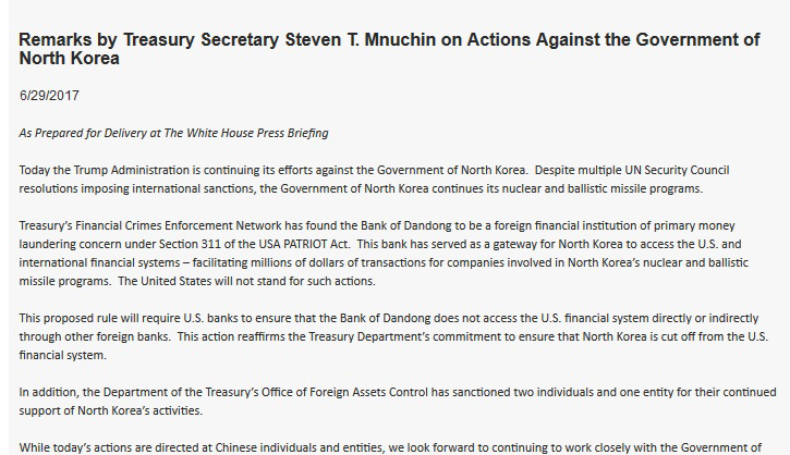 Американското министерство на финансите обяви санкции срещу китайска банка, няколко компании и китайски граждани, заради тясното им сътрудничество с режима в Северна Корея.