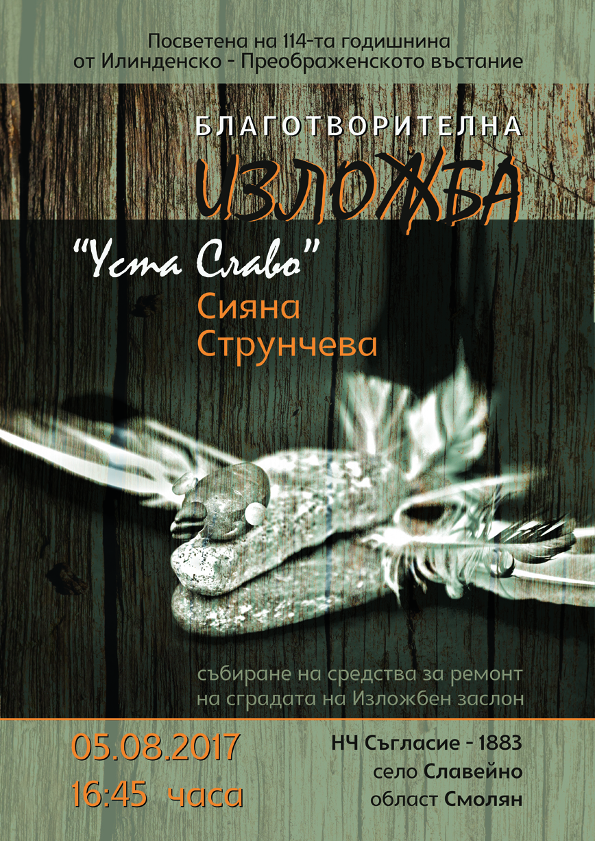 На 5 август 2017 г. в Народно читалище „Съгласие – 1883” в с. Славейно, община Смолян, се открива първата самостоятелна изложба на СИЯНА ИЛИЕВА СТРУНЧЕВА, художник-педагог. Изложбата „УСТА СЛАВО“, която е част от Националния тракийски събор за честване 114 години от Илинденско-Преображенското въстание, представя поредица изяви на авторката в областта на изобразителното, приложното и фотографското изкуство. Изложбата ще бъде отворена до 31 август 2017 г.