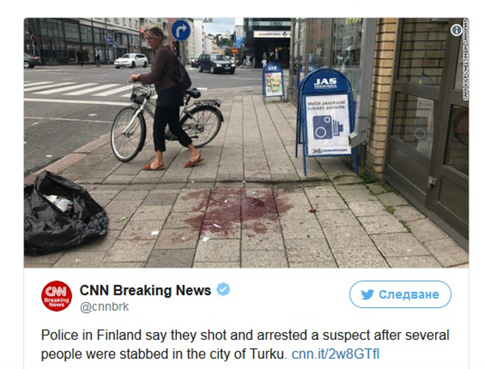 Няколко души бяха прободени днес с нож на оживена улица във финландския град Турку. Градът се намира на около 150 км западно от столицата Хелзинки. По първоначална информация двама души са загинали и шестима са били ранени при днешното нападение в Турку. Предполагаемият извършител е бил арестуван, след като полицаи са го простреляли в грака. Силите на реда издирват евентуални съучастници. По информация на финландското вътрешно министерство нападателят не е гражданин на Финландия, предаде БТА, цитирайки ТАСС.