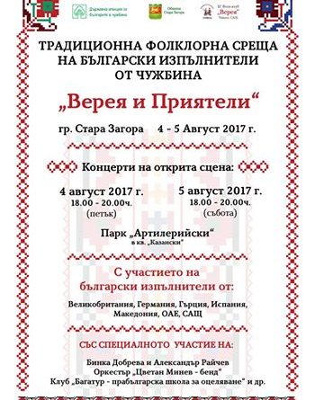 На 4 и 5 август 2017 г. (петък и събота) в новия парк на Стара Загора ще се проведе четвъртата среща „Верея и приятели“. В нея ще участват певци, инструменталисти и танцьори от три континента. В първия ден своя талант и обич към родното българско изкуство ще представят Моника Азманска от Дубай; Камерен танцов състав „Чемшири“ от Северна Ирландия и Пламена Чемширова; Никол Михалик; Ева и Вики Маркови; Дует „Щурчовци“ от Гърция; Танцов клуб „Тракийци“; 6-годишният Александър Минчев и Ивиана Дончева Умурска от Испания; Танцов клуб „Купонджии“; Танцов клуб за народни хора – „Нашенци“, със специалното участие на народната певица Бинка Добрева и музикантът Александър Райчев.