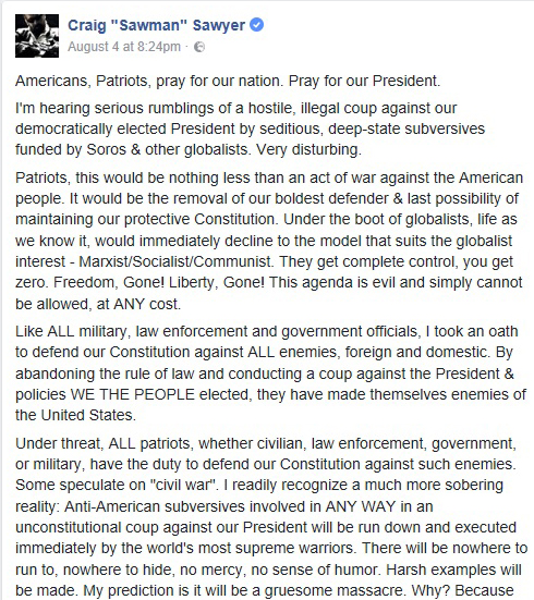 Във Facebook пост, публикуван в петък, Крейг „Sawman“ Сойер – моряк ветеран, бивш морски ”тюлен”, снайперист, треньор по силова борба и собственик на Tactical Insider, предупреждава за „страшно клане“, ако президентът Тръмп бъде отстранен от поста си.