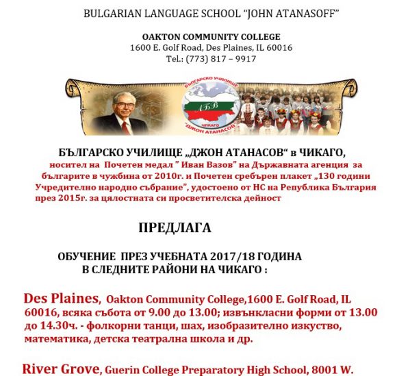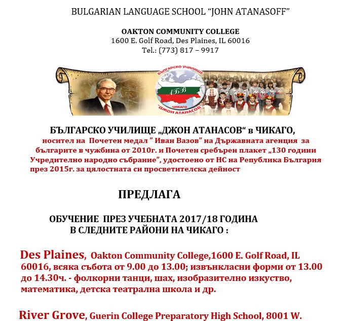 Oakton Community College, 1600 E. Golf Road, IL 60016, всяка събота от 9.00 до 13.00; извънкласни форми от 13.00 до 14.30 ч. – фолкорни танци, шах, изобразително изкуство, математика, детска театрална школа и др.;